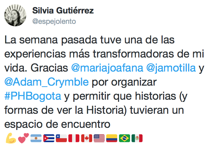 Tweet by Silvia Gutiérrez about her time in Bogotá.